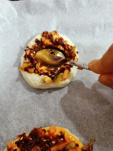 - Hamurların üzerlerine kaşıkla bastırarak hamuru daha ince hale getiriniz ve sosunun da hamura yapışmasını sağlamış olacaksınız.