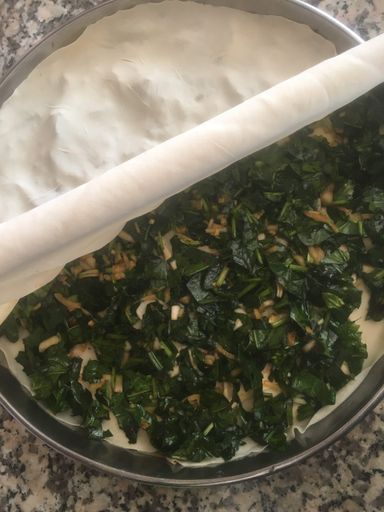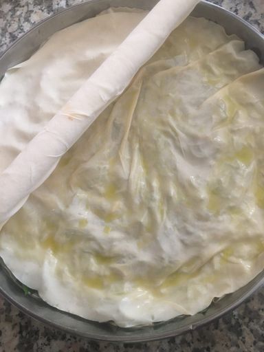 - Üç kat yufkayı üst üste dizerken; yufkaların aralarını, her koyduğumuz bir kat yufkada yağlayarak diğer yufkayı serelim ve üçüncü kat yufkadan sonra iç harcımızı yerleştirelim, sonraki üç kat yufkayı tekrar aralarını yağlayarak dizelim.Sonra harcın ikinci yarısını da eşit olarak yerleştirelim.